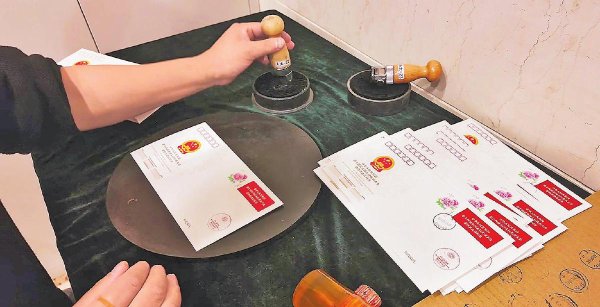 工作人員為全國(guó)兩會(huì)紀(jì)念封加蓋紀(jì)念戳