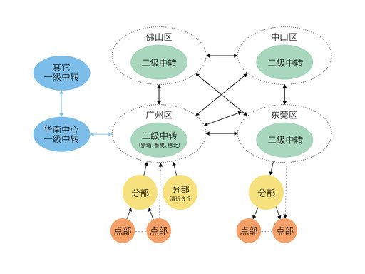 順豐、通達(dá)系基本是網(wǎng)狀網(wǎng),在省內(nèi)有多個分撥中心,分撥中心之間點對點直達(dá),且在處理中心主要采用“散件+集包”的方式,郵件集中到達(dá)、集中交換,在處理中心時間更短;而郵政主要是采取點對集散的方式,所有郵件在一個中心交換,導(dǎo)致部分地市互寄的郵件銜接時間較短或不能趕發(fā)有效頻次,需在處理中心停留到下一個頻次才能發(fā)運,導(dǎo)致郵件在處理中心時間過長?!耙虼?,為了進(jìn)一步縮短時限,郵政在網(wǎng)絡(luò)布局時就應(yīng)逐步將單點集散網(wǎng)升級到多中心網(wǎng)狀網(wǎng),充分發(fā)揮中山、東莞、深圳等節(jié)點功能,形成區(qū)域網(wǎng),各區(qū)域、各中心直接夠量直達(dá);同時,打破行政區(qū)域,以時限、效益優(yōu)先為原則,靈活組網(wǎng)?!壁w洪濤告訴記者。