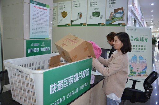 截至4月底,江蘇省東臺(tái)市郵政分公司日均回收快遞包裹箱約85個(gè)。4月22日,在第50個(gè)世界地球日,東臺(tái)市分公司因地制宜在32個(gè)郵政網(wǎng)點(diǎn)設(shè)置快遞包裝物共享站,啟動(dòng)快遞包裝物循環(huán)利用工作,旨在推動(dòng)綠色郵政建設(shè),切實(shí)踐行綠色發(fā)展理念。圖為在東亭路支局領(lǐng)取包裹的客戶(hù)將包裝箱投入共享站。 □單國(guó)勝 攝影報(bào)道