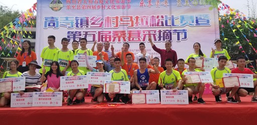 四川省樂(lè)至縣高寺鎮(zhèn)桑葚采摘節(jié)活動(dòng)中“鄉(xiāng)村馬拉松比賽”獲獎(jiǎng)?wù)吆嫌?。趙彥成 攝