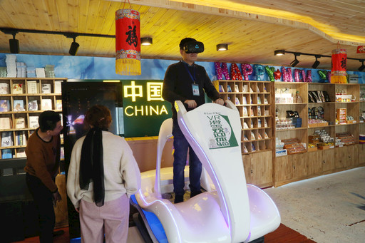 游客在冰雪大世界主題郵局體驗(yàn)VR滑雪。