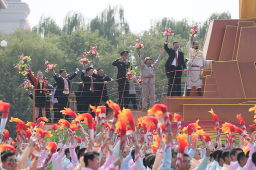 10月1日,在國(guó)慶70周年群眾游行活動(dòng)中,其美多吉在“凝心鑄魂”方陣主題彩車上接受檢閱?!豆と巳?qǐng)?bào)》記者 王偉偉 攝