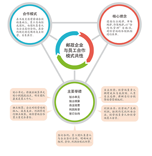 浙江義烏郵政的“準(zhǔn)加盟”制、云南郵政的“創(chuàng)客計劃”、山東郵政的“合伙人”制以及湖南郵政的“眾創(chuàng)眾享工程”,盡管模式千差萬別,但原理大同小異,若從方法論的角度探究,離不開基于“合約”之上的資源配置,主要體現(xiàn)在:劃小經(jīng)營核算單元與所有權(quán)分配思想的建立;內(nèi)部市場化與經(jīng)營責(zé)任單元的利益分配;利益共同體的形成與體制機(jī)制改革的真正落地。