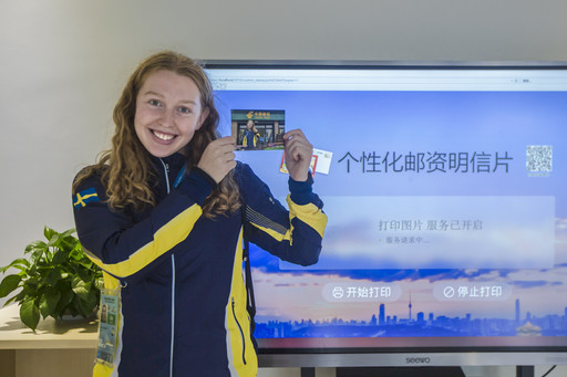外國運(yùn)動員展示剛剛打印的個性化明信片。