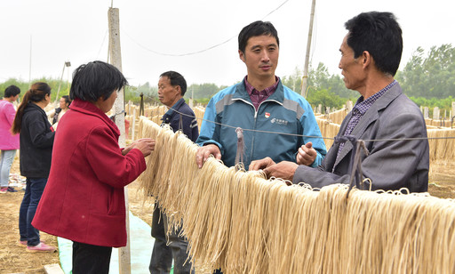 江蘇省豐縣郵政分公司王溝鎮(zhèn)鄉(xiāng)郵員趙本增熱心幫助當?shù)匕傩彰撠氈赂?。圖為10月12日,趙本增途經(jīng)粉條晾曬基地,主動提議用自己的“農(nóng)民致富微信朋友圈”發(fā)信息幫經(jīng)營業(yè)主賣粉條?! 醪窇c海 劉立明 攝影報道