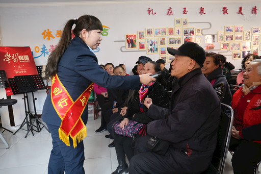 健康講座,郵政工作人員和老人互動。王圓圓 攝