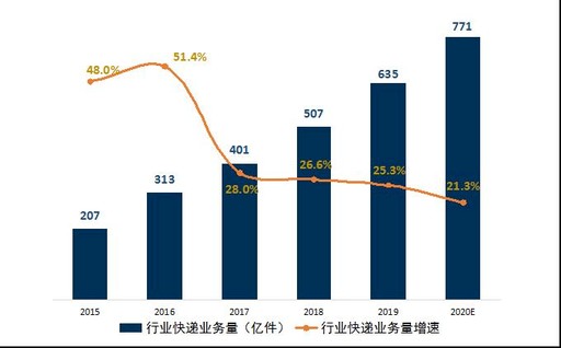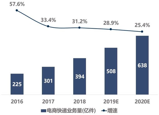 保持高位增長。2019年1月至11月,全國實(shí)物商品網(wǎng)上零售額為8.5萬億元,同比增長19.5%,增速進(jìn)一步放緩。結(jié)合申萬宏源證券預(yù)測結(jié)果,2020年,國內(nèi)電商快遞業(yè)務(wù)量增速將在25%左右。(見圖4)