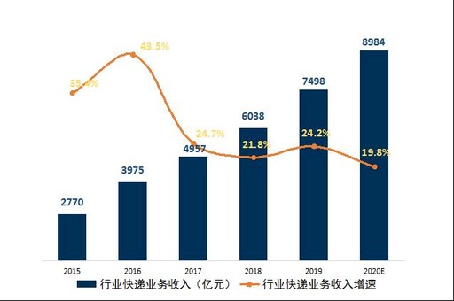 快遞行業(yè)繼續(xù)保持較高增速。2019年,全國快遞服務(wù)企業(yè)業(yè)務(wù)量累計(jì)完成635億件,同比增長25.3%,業(yè)務(wù)收入累計(jì)完成7498億元,同比增長24.2%。經(jīng)測算,預(yù)計(jì)2020年快遞行業(yè)業(yè)務(wù)量約為771億件,增速為21.3%;業(yè)務(wù)收入約為8984億元,增速為19.8%。(見圖1、圖2)