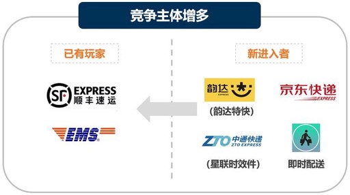 參與主體增多。京東開放個(gè)人寄件服務(wù),通達(dá)系打造直營標(biāo)快品牌,此外,即時(shí)配送強(qiáng)勢沖擊同城時(shí)效快遞,既有競爭格局面臨更多變數(shù)。(見圖3)