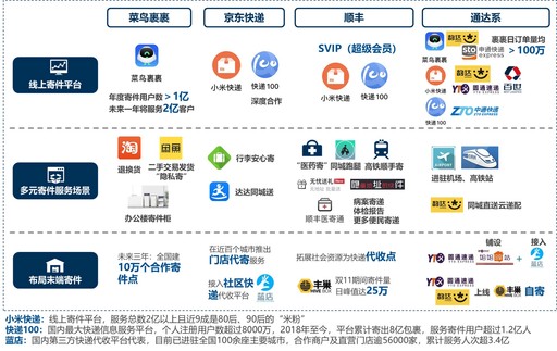 爭奪個(gè)人寄件市場,拓展業(yè)務(wù)來源。加快布局線上線下個(gè)人寄件流量入口,快遞企業(yè)紛紛接入菜鳥裹裹、小米快遞等第三方線上寄件平臺,并通過官方在線寄件平臺發(fā)力會(huì)員營銷;同時(shí),不斷拓展末端自有服務(wù)網(wǎng)點(diǎn)、社會(huì)門店(代寄)、線下快遞代收平臺、智能快遞柜等寄件接口。圍繞個(gè)人寄件需求布局多元服務(wù)場景,菜鳥裹裹從退換貨延伸到辦公、二手交易等寄件場景,快遞公司圍繞出行、本地生活、就醫(yī)等場景推出全新寄件產(chǎn)品。(見圖6)