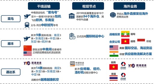 加碼跨境、拓展海外,搶抓國際化機(jī)遇。圍繞周邊國家持續(xù)升級跨境網(wǎng)絡(luò)能力,以開通國際航線、貨運(yùn)包機(jī)、搭載中歐班列等方式,加強(qiáng)跨境干線運(yùn)輸能力,并加大以海外倉為主的境外樞紐節(jié)點(diǎn)建設(shè)。通過“資本運(yùn)作+自建+加盟”方式,聚焦東南亞地區(qū)加速拓展海外本土快遞市場,并推動(dòng)海外業(yè)務(wù)從快遞向國際貨運(yùn)、供應(yīng)鏈、裝備技術(shù)拓展,如順豐為印度中國企業(yè)提供大型工廠設(shè)備搬遷、零配件及成品交付等供應(yīng)鏈物流解決方案;圓通開始向東南亞輸出物流裝備技術(shù)。民營快遞國際化布局將進(jìn)一步提速。(見圖9)