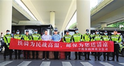 7月29日上午,中郵保險(xiǎn)河南分公司開(kāi)展夏日送清涼活動(dòng),為鄭州交警一大隊(duì)鐵騎中隊(duì)送去礦泉水、洗漱用品等防暑降溫物資,對(duì)他們堅(jiān)守崗位、無(wú)私奉獻(xiàn)表示親切慰問(wèn),為保障轄區(qū)道路交通安全所付出的辛勤勞動(dòng)表示感謝。