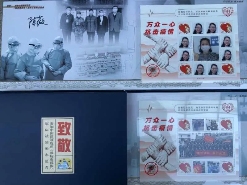 在陳薇院士和團隊成員張振威主任、邵龍飛教授以及郵政工作人員的共同努力下,武漢市分公司先后為參加重組新冠疫苗I期、Ⅱ期臨床試驗的志愿者設(shè)計制作了2000套紀念品,均在第一時間送往陳薇團隊駐地,讓這份心意能最快地到達志愿者手中,傳遞到他們心里。