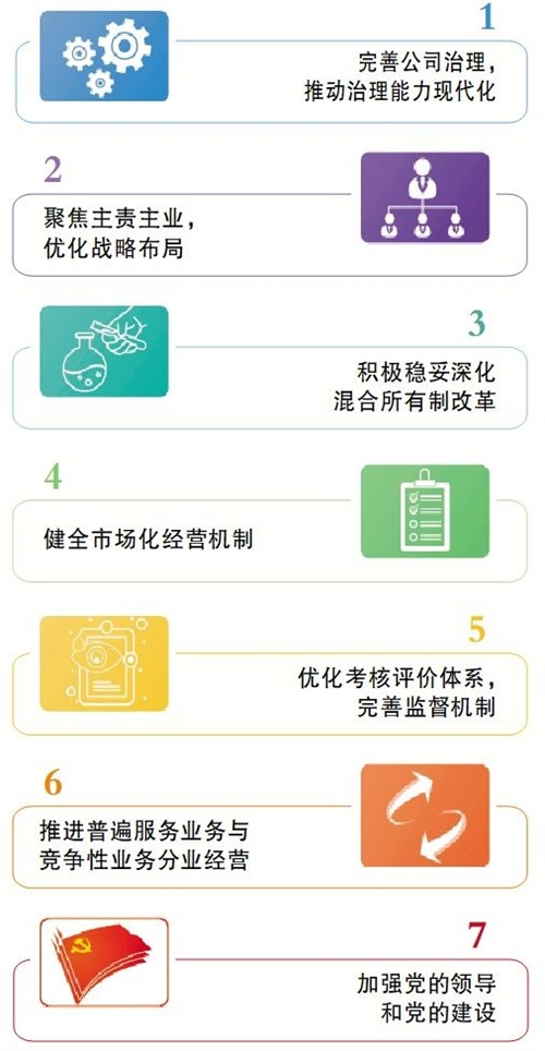 2.七個方面重點改革任務(wù)?!秾嵤┓桨浮犯鶕?jù)中國郵政改革落地過程中遇到的重點難點問題,提出:一是完善公司治理,推動治理能力現(xiàn)代化,全面貫徹“兩個一以貫之”,把黨的領(lǐng)導(dǎo)融入公司治理各環(huán)節(jié),實現(xiàn)制度化、規(guī)范化、程序化,加強董事會建設(shè),落實董事會職權(quán),保障經(jīng)理層依法行權(quán)履職,開展對標(biāo)世界一流企業(yè)管理提升行動,加強各類風(fēng)險管控,完成子企業(yè)公司制改制。二是聚焦主責(zé)主業(yè),優(yōu)化戰(zhàn)略布局,圍繞服務(wù)國家戰(zhàn)略,構(gòu)筑中國郵政高質(zhì)量發(fā)展的“四梁八柱”,推動普遍服務(wù)能力提升,推動寄遞業(yè)務(wù)核心競爭力提升,推動郵儲銀行高質(zhì)量發(fā)展,推動代理金融轉(zhuǎn)型發(fā)展,推動中郵保險價值發(fā)展,推動農(nóng)村電商生態(tài)圈建設(shè),推動惠農(nóng)合作項目協(xié)同發(fā)展,推動資產(chǎn)重組與盤活,推動自主創(chuàng)新能力提升,清理退出不具備競爭優(yōu)勢的非主營業(yè)務(wù)和低效無效資產(chǎn),完成剝離國有企業(yè)辦社會職能,解決歷史遺留問題。三是積極穩(wěn)妥深化混合所有制改革,把握好改革方向,務(wù)求改革實效,避免盲目性,避免一混了之。按照完善治理、強化激勵、突出主業(yè)、提高效率的要求,堅持因地施策、因業(yè)施策、因企施策,宜獨則獨、宜控則控、宜參則參,分層分類深化混合所有制改革,穩(wěn)慎開展混合所有制企業(yè)骨干員工持股,推動混合所有制企業(yè)深度轉(zhuǎn)化經(jīng)營機制,加強對混合所有制改革全過程的監(jiān)督,防止國有資產(chǎn)流失。四是健全市場化經(jīng)營機制,強化各層級郵政企業(yè)、控股子公司市場主體地位,切實深化勞動、人事、分配三項制度改革,推行經(jīng)理層成員任期制和契約化管理,全面推進用工市場化,完善市場化薪酬分配機制,穩(wěn)慎開展控股子公司中長期激勵。五是優(yōu)化考核評價體系,完善監(jiān)督機制,完善戰(zhàn)略績效考核評價體系,健全協(xié)同高效的監(jiān)督機制。六是認真貫徹落實《關(guān)于新時代加快完善社會主義市場經(jīng)濟體制的意見》要求,推進普遍服務(wù)業(yè)務(wù)與競爭性業(yè)務(wù)分業(yè)經(jīng)營。七是加強黨的領(lǐng)導(dǎo)和黨的建設(shè),加強黨的政治建設(shè),推進黨建工作與生產(chǎn)經(jīng)營深度融合,加強領(lǐng)導(dǎo)班子建設(shè)和人才隊伍建設(shè),激勵領(lǐng)導(dǎo)人員擔(dān)當(dāng)作為,持續(xù)深入推進全面從嚴(yán)治黨。