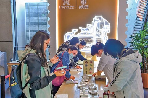 游客在中國(guó)工藝美術(shù)博物館(中國(guó)非物質(zhì)文化遺產(chǎn)館)主題郵局內(nèi)打卡蓋戳?! 躐R佳玉 攝