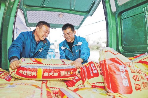 河南省駐馬店市遂平縣郵政分公司農(nóng)資配送員李華偉(右)和攬投員李勇一起,趕往陽豐鎮(zhèn)黑趙村綜合便民服務(wù)站,送去該村村民訂購的復(fù)合肥。店主張行夸獎(jiǎng)道:“郵政服務(wù)好,配送及時(shí),農(nóng)肥質(zhì)量有保證?!薄 踔袊]政報(bào)記者 賈紅偉 通訊員 李平 殷明珠 攝影報(bào)道