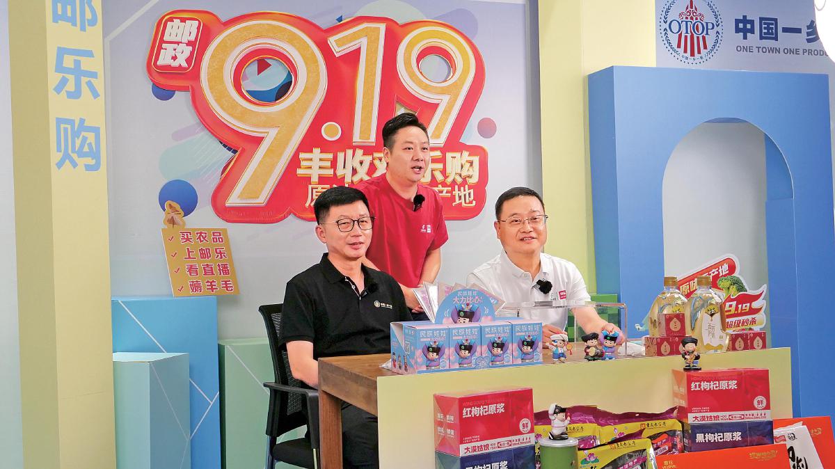 李唐(右)、中國(guó)民族貿(mào)易促進(jìn)會(huì)會(huì)長(zhǎng)藍(lán)軍(左)走進(jìn)郵樂(lè)直播間為優(yōu)質(zhì)農(nóng)品“帶貨”。