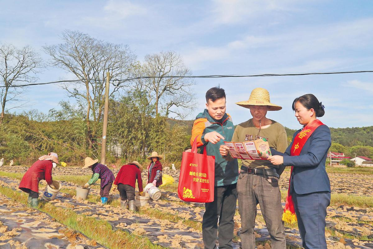 萬(wàn)安縣枧頭郵政所員工春耕時(shí)節(jié)走進(jìn)田間地頭,向村民普及金融知識(shí)?! 豕苫āz