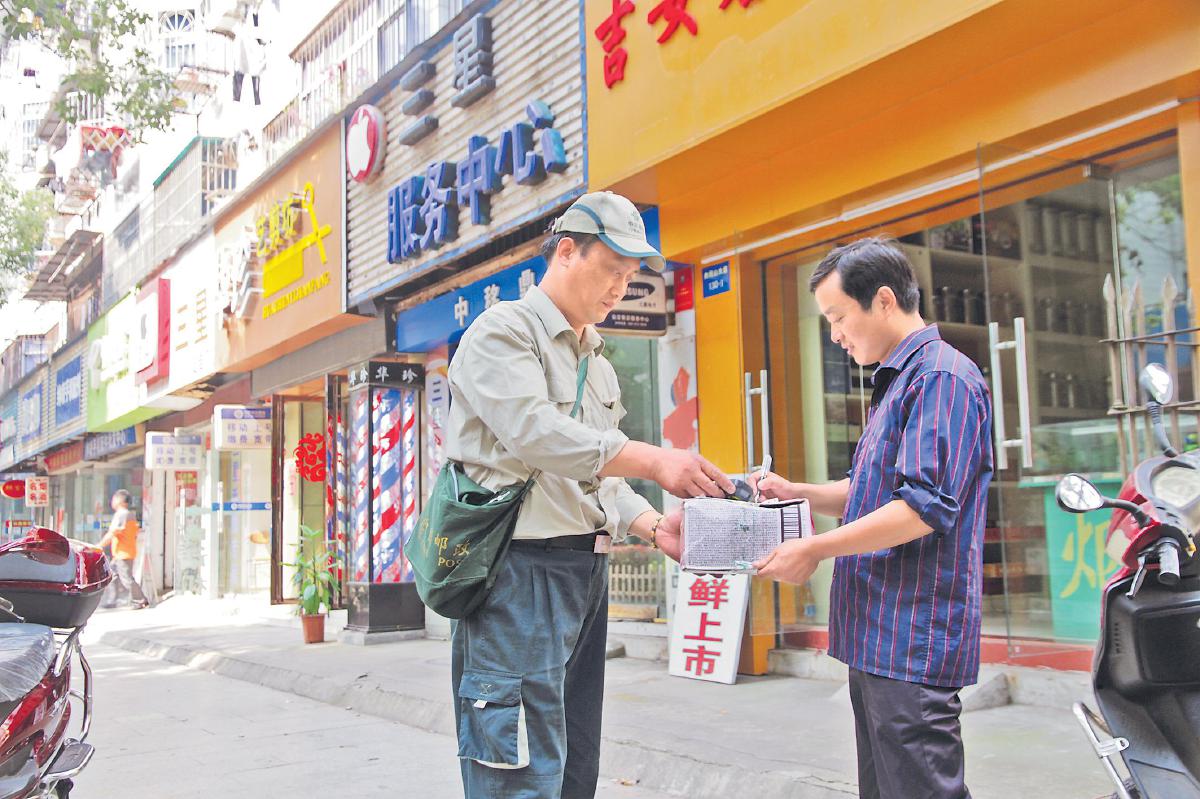吉州區(qū)鷺洲投遞部攬投員周東亮上門為客戶收寄郵件?! 豕鶗匝唷z