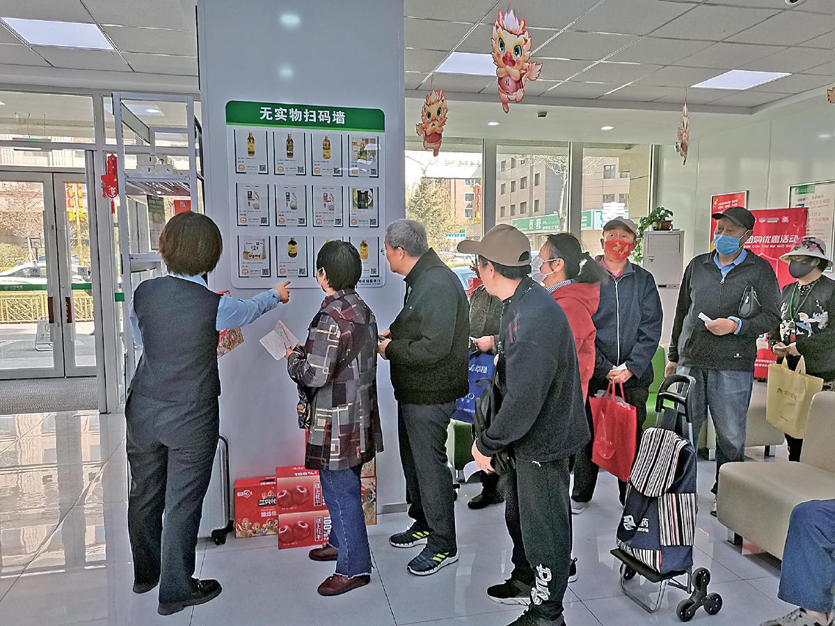 長(zhǎng)春郵政在營(yíng)業(yè)廳設(shè)置無(wú)實(shí)物掃碼墻,方便會(huì)員在線(xiàn)選購(gòu)商品。□吳巖 攝