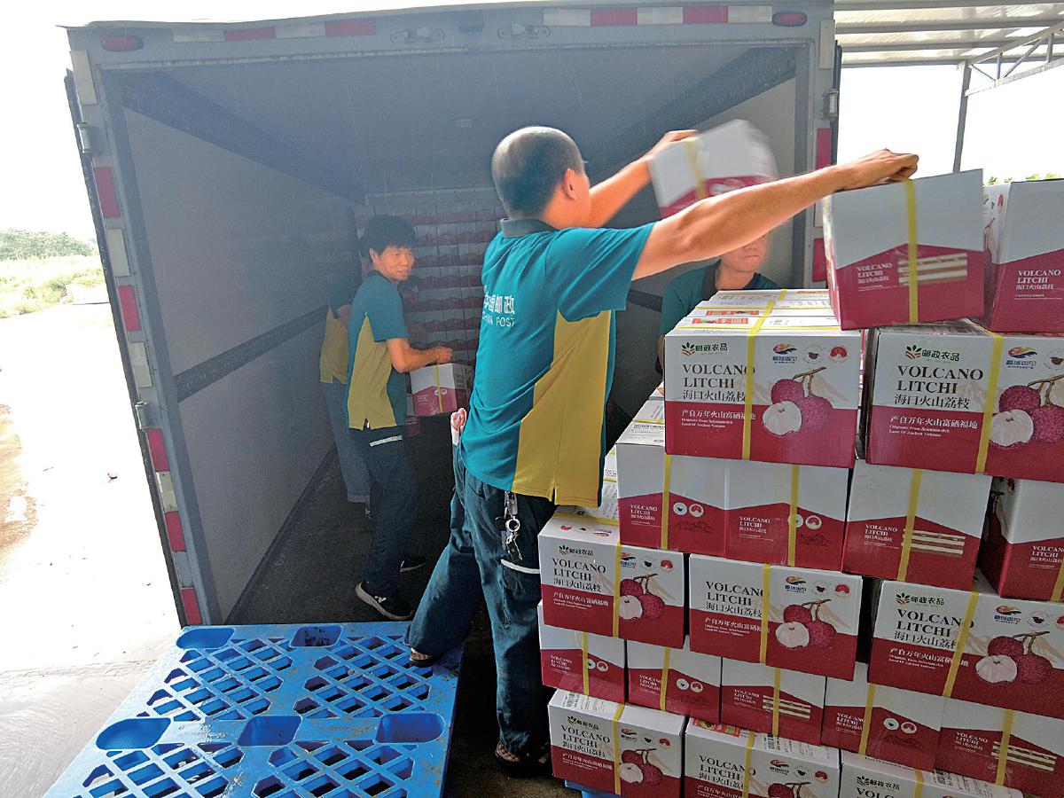 郵政工作人員正在將荔枝郵件搬運(yùn)裝車(chē)?!踔袊?guó)郵政報(bào)記者 黃文燕 攝
