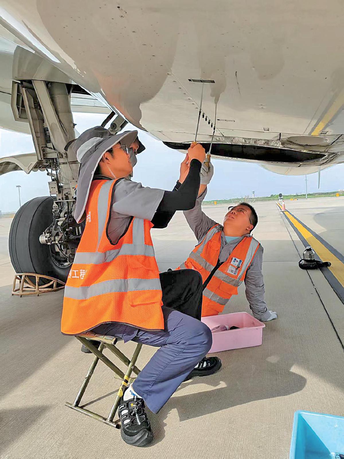 炎炎烈日,熱浪吹襲。連日來,郵航機(jī)務(wù)人員冒著高溫,堅(jiān)守在停機(jī)坪上做好飛機(jī)維護(hù)工作,確保飛機(jī)安全飛行萬無一失。圖為在地表溫度超過50攝氏度的南京祿口機(jī)場郵政自主機(jī)坪,郵航機(jī)務(wù)人員在清潔飛機(jī)空調(diào)熱交換器。