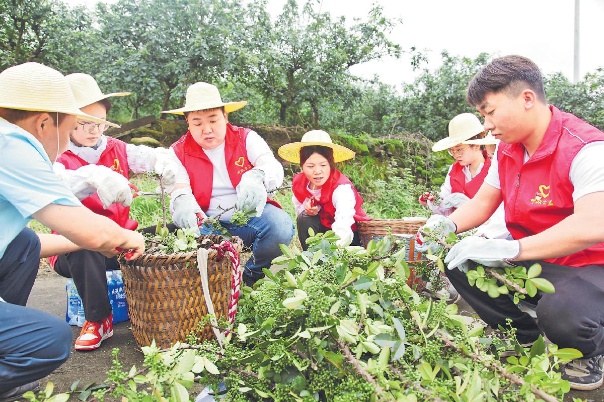 近日,重慶市江津區(qū)青花椒豐收了。江津區(qū)國際花椒產(chǎn)業(yè)城臨時(shí)開市運(yùn)營。在距市場不足1公里的先鋒鎮(zhèn)雙寶村椒農(nóng)袁必蘭家的花椒地里,江津區(qū)郵政分公司一群青年員工身著紅色志愿馬甲,忙著提籃采摘花椒?;ń肪G與志愿紅的交織,共同繪就了一幅美好的豐收畫卷。袁必蘭對前來幫忙的郵政青年連聲道謝。