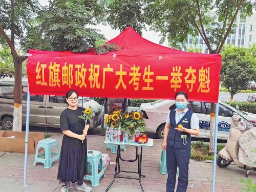 6月7日,河南省新鄉(xiāng)市紅旗區(qū)郵政分公司人民西路支局在高考考點外設(shè)置“愛心驛站”,驛站特地準(zhǔn)備了橙子和向日葵,祝愿廣大考生一舉奪魁??荚嚻陂g,該支局員工積極向家長介紹郵政金融產(chǎn)品?! 趵钏加辍z影報道