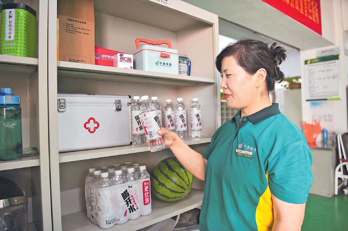6月以來,河南省氣象臺連續(xù)發(fā)布多個(gè)高溫紅色預(yù)警。為應(yīng)對極端高溫天氣、保障企業(yè)安全穩(wěn)定運(yùn)行,河南省郵政分公司要求所轄各級郵政企業(yè)加強(qiáng)對員工的關(guān)心關(guān)愛,做好一線生產(chǎn)人員的健康監(jiān)測,尤其是對攬投、分揀等一線生產(chǎn)人員,適當(dāng)調(diào)整作業(yè)時(shí)間,備齊防暑藥品及防暑飲品,聯(lián)合工會積極開展“夏日送清涼”等慰問活動,確保員工身體健康與生產(chǎn)安全。圖為鄭州市鄭東新區(qū)郵政分公司常寨攬投部為攬投員配備了防暑物品和藥品等。