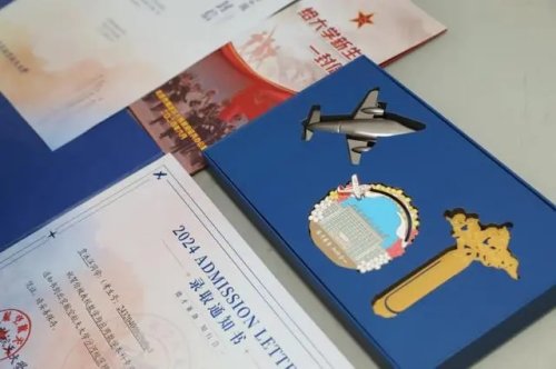 啟封北航2024年本科生錄取通知書,首先映入眼簾的是封套的北航藍,封面上燙金的背影則代表著所有北航新生即將開啟人生的金色新篇,實現(xiàn)手可摘星辰的夢想。翻開內封,校訓“德才兼?zhèn)?,知行合一”是送給新北航人的第一句囑托。