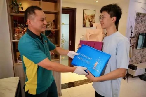 7月10日下午1點,2024年江蘇全省首封高考錄取通知書花落常州。中國郵政常州市分公司天寧攬投部投遞員、“常州市五一勞動獎章”獲得者徐大磊冒雨僅用20分鐘,將北京航空航天大學的錄取通知書送達考生賈沐洋手中,并向他表示祝賀。