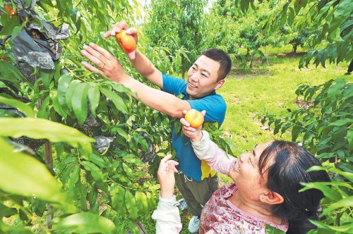 郵政員工與桃農(nóng)一起采摘鮮桃,共享豐收的喜悅?!跞f宇 攝
