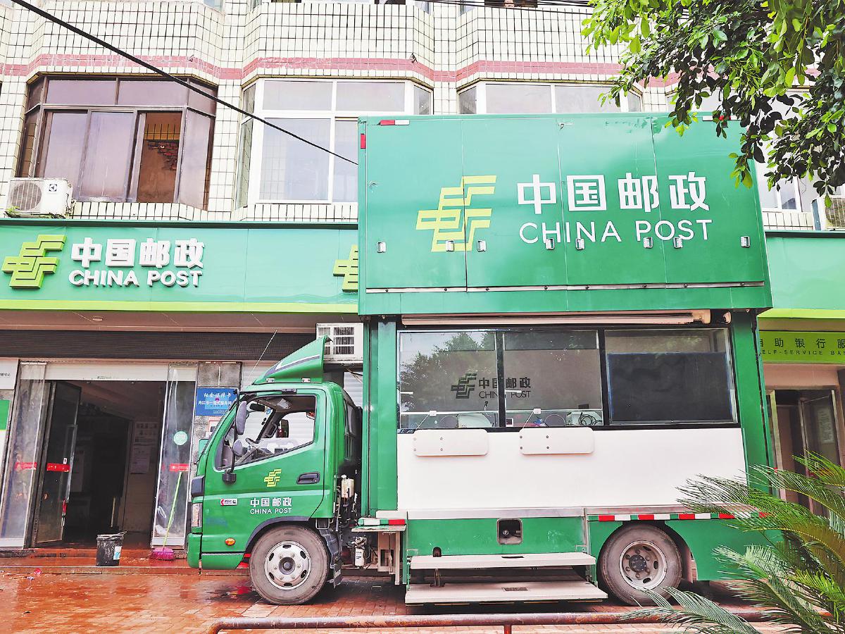 洪水退去后,四川省內(nèi)江市郵政分公司配備移動(dòng)服務(wù)車,第一時(shí)間恢復(fù)業(yè)務(wù)辦理。