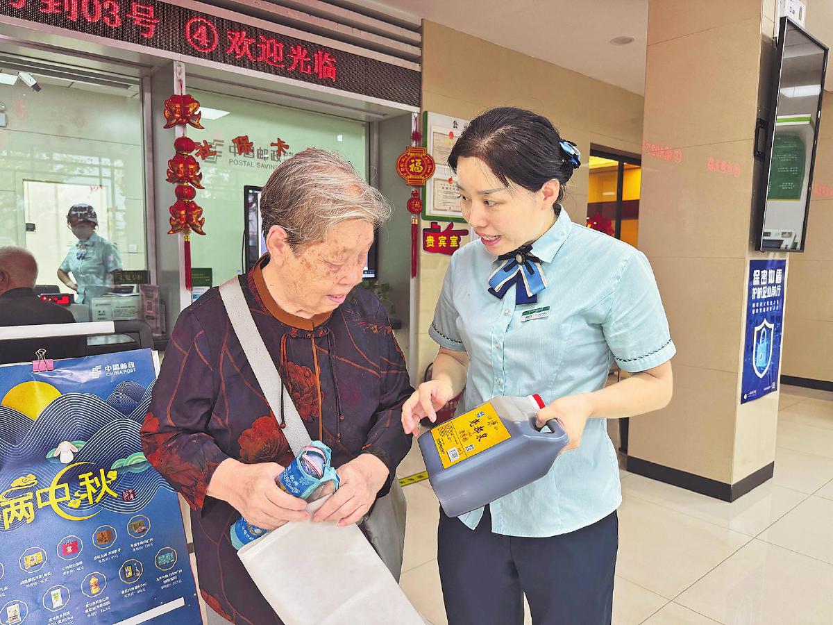 “月滿中秋”活動(dòng)中,郵政網(wǎng)點(diǎn)員工向客戶推介陳醋產(chǎn)品。