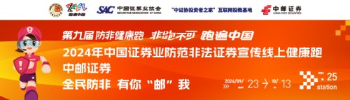 為進(jìn)一步加大防范非法證券活動(dòng)正面宣傳力度,更加有效地保護(hù)投資者合法權(quán)益,倡導(dǎo)全民健康生活方式,履行證券行業(yè)社會(huì)責(zé)任,在中國(guó)證券業(yè)協(xié)會(huì)、中國(guó)田徑協(xié)會(huì)、中國(guó)證監(jiān)會(huì)陜西監(jiān)管局、中共陜西省委金融委員會(huì)辦公室、陜西證券期貨業(yè)協(xié)會(huì)等多家單位的指導(dǎo)下,中郵證券于2024年9月23日正式啟動(dòng)“2024年中國(guó)證券業(yè)防范非法證券宣傳線(xiàn)上健康跑”第二十五站公益活動(dòng),歷時(shí)21天,于10月13日?qǐng)A滿(mǎn)收官。