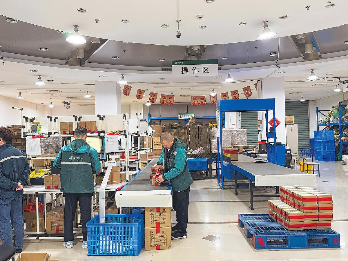 在上海郵政設(shè)立的互聯(lián)網(wǎng)醫(yī)院項(xiàng)目專項(xiàng)處理點(diǎn),郵政工作人員正在封裝藥品郵件?! 蹶悤月贰z