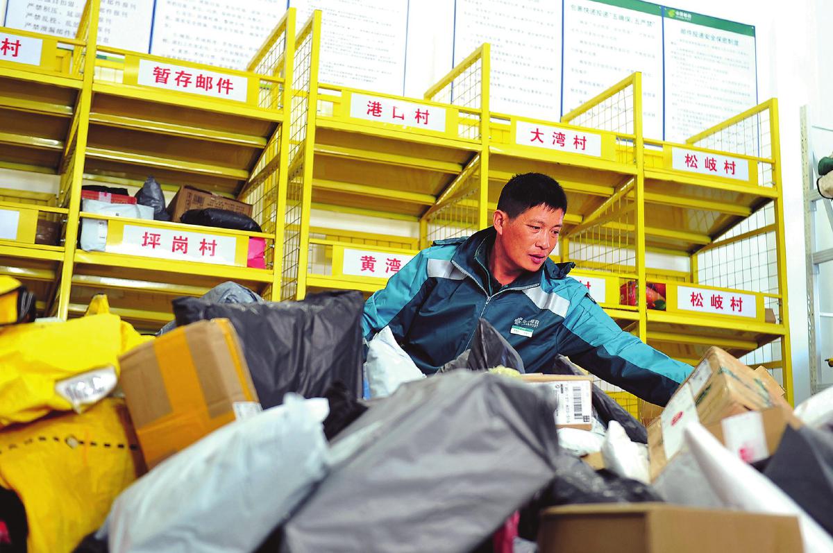 石進(jìn)全分揀當(dāng)天要配送的郵件?! 跷鋪喠翑z