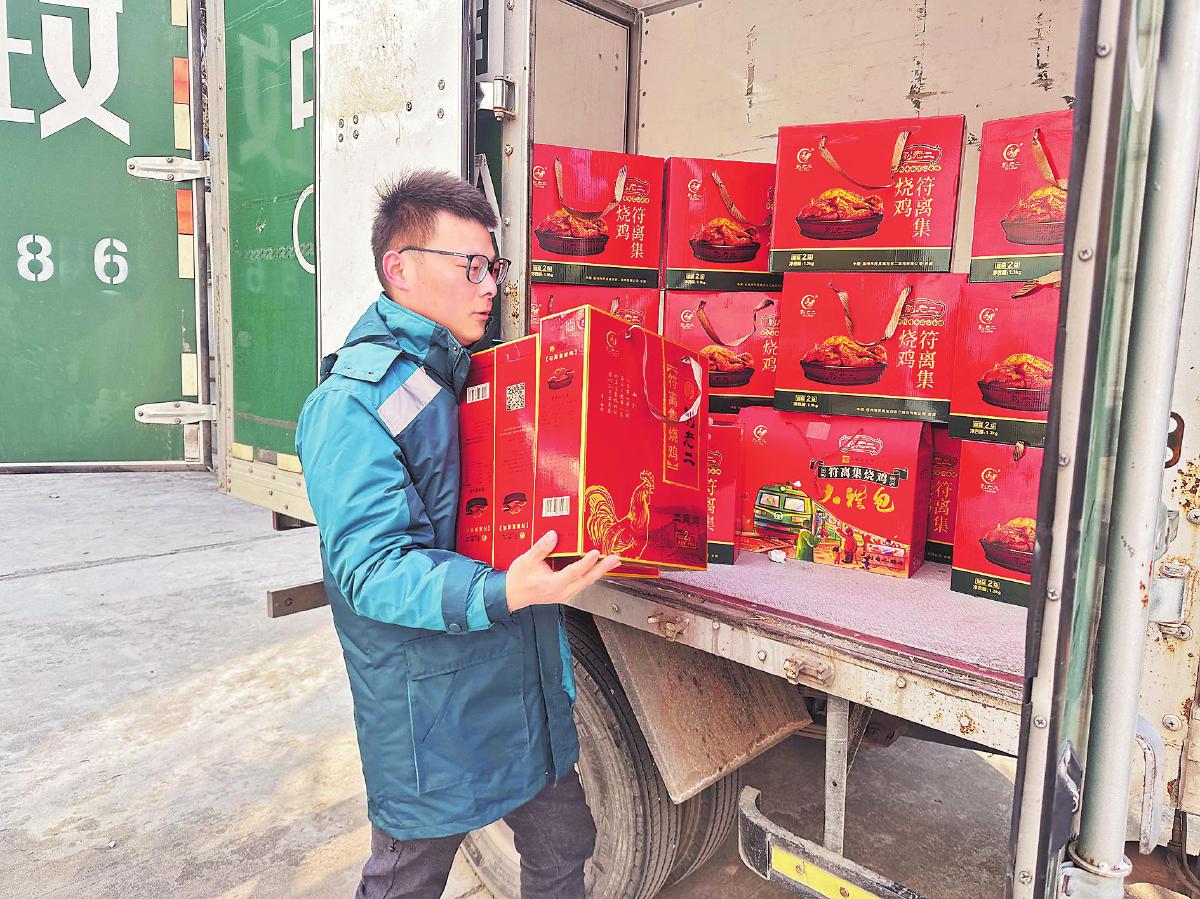 劉闖將劉老二年貨燒雞搬上郵車。□毛圣茹 攝
