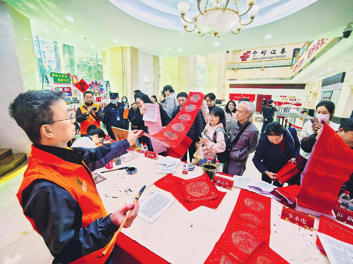 祥龍擺尾送舊歲,靈蛇獻(xiàn)瑞啟新春。臨近春節(jié),廣東省深圳市郵政分公司工會(huì)牽頭開展了“蛇來運(yùn)轉(zhuǎn) 郵行千里 福送萬家”義寫春聯(lián)活動(dòng)。在寶通大廈、福田濱海營業(yè)所、郵政大廈“職工之家”,特邀的書法家們在一張張喜慶的紅紙上揮毫潑墨,一副副春聯(lián)、一個(gè)個(gè)“?!弊周S然紙上,將飽含著的濃濃喜氣和美好的祝福傳遞給了基層員工和附近的社區(qū)居民。
