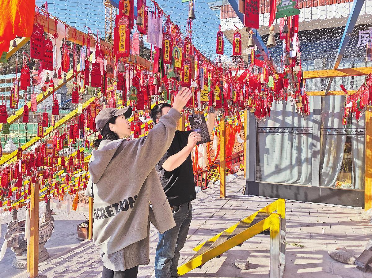 游客在郵局專門(mén)設(shè)置的祈福區(qū)掛上許愿牌。