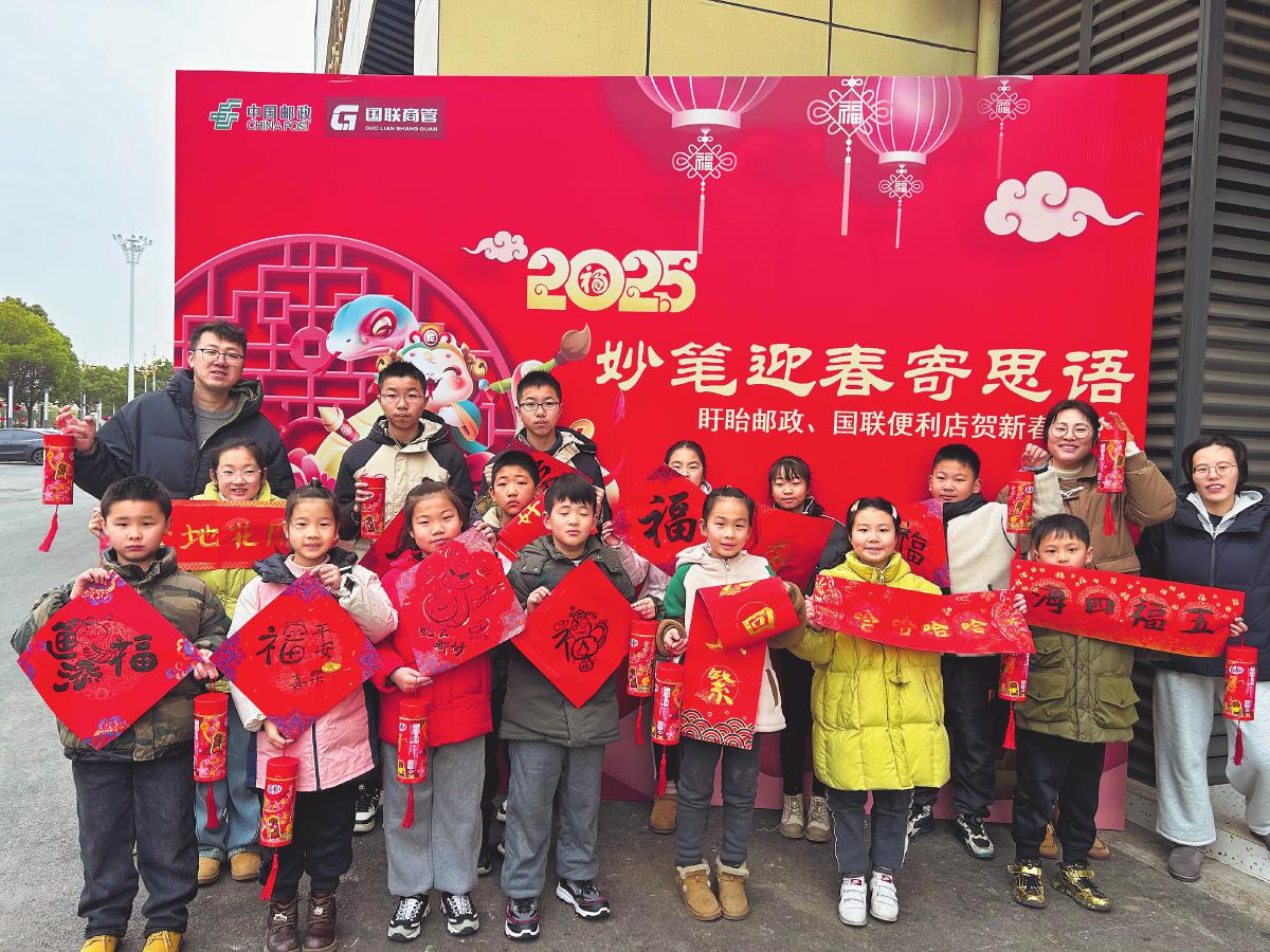 江蘇 盱眙縣郵政分公司邀約全縣中小學(xué)學(xué)生代表參加“妙筆迎春寄思語”活動。同學(xué)們一筆一劃地書寫出對新年的美好祝愿?!蹶悵崱z影報道