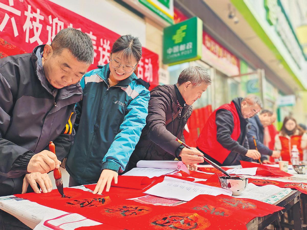 春節(jié)前夕,貴州省六盤水市六枝特區(qū)郵政分公司攜手特區(qū)總工會和特區(qū)書法家協(xié)會舉辦“筆走龍蛇祈平安,翰墨飄香迎新春”活動,免費(fèi)為群眾寫“?!弊?、送春聯(lián)?! 踉k 攝