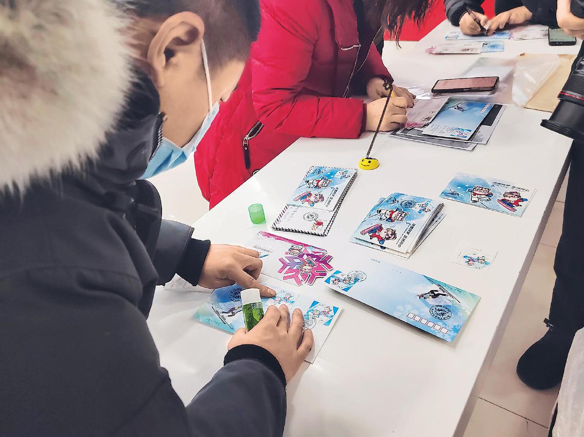 集郵愛(ài)好者在亞冬會(huì)紀(jì)念郵票首發(fā)現(xiàn)場(chǎng)自制首日封?! 鯊埖さぁz