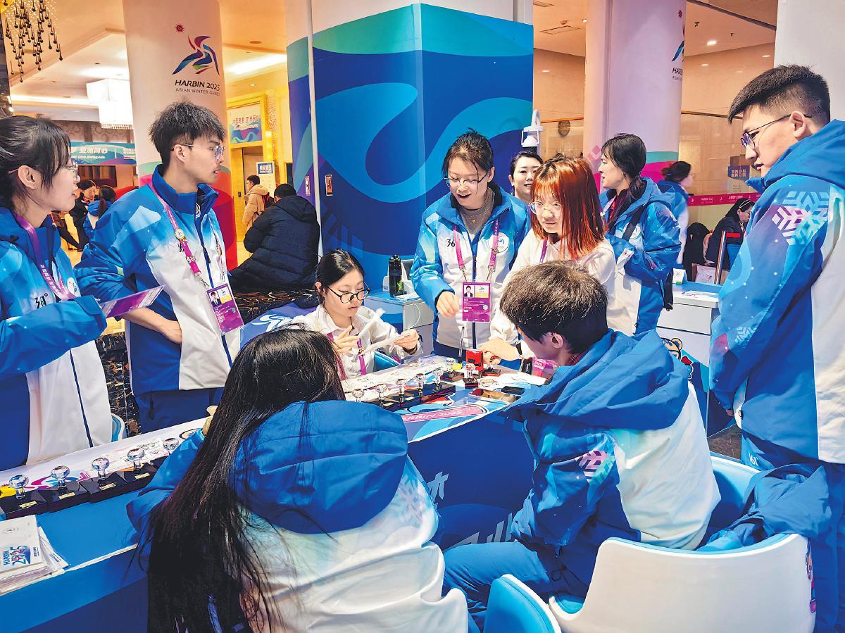 亞冬會(huì)志愿者在北大荒運(yùn)動(dòng)員村主題郵局打卡留念?!鯀菚蕴臁z