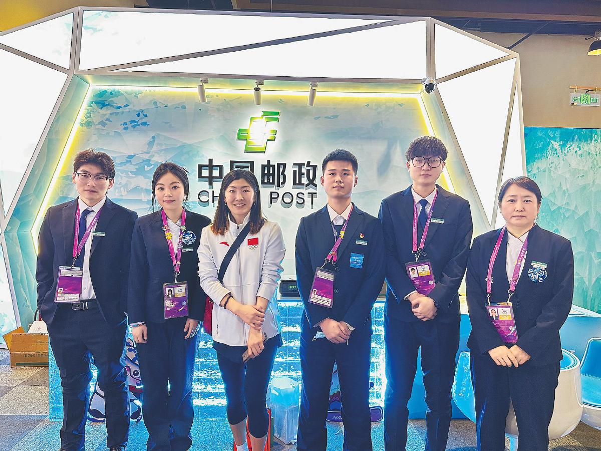 中國(guó)雪上項(xiàng)目首位全滿貫獲得者、本屆亞冬會(huì)自由式滑雪女子空中技巧項(xiàng)目冠軍徐夢(mèng)桃(左三)在雅旺斯主題郵局郵寄包裹后,與郵政員工合影留念。□倪世雄 攝