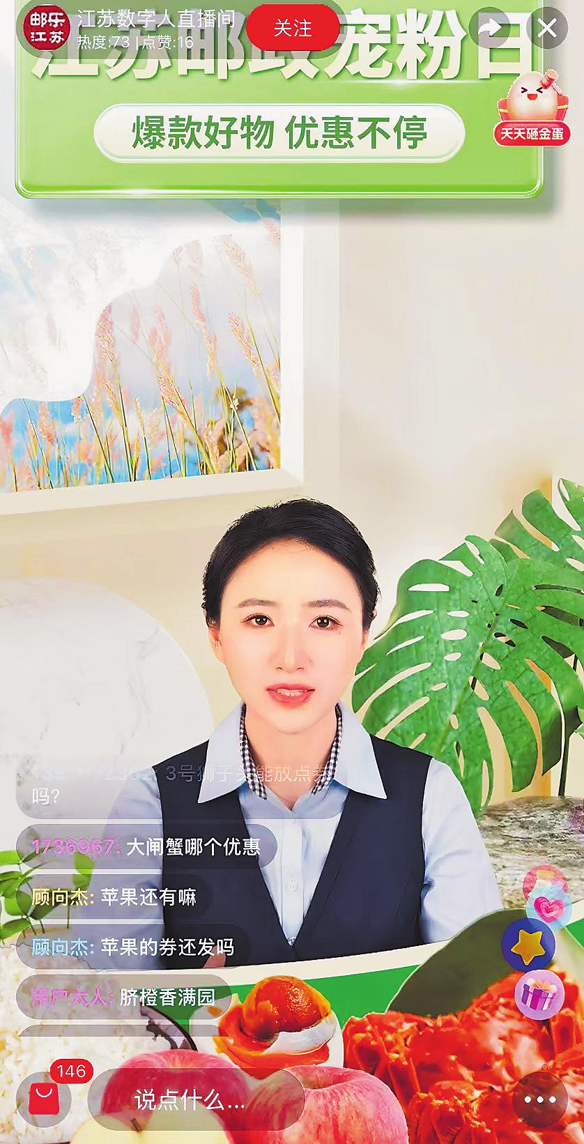 “每一口,都能感受到牛肉的鮮美和高原的純凈……”2024年3月4日,一身大紅色衛(wèi)衣、體態(tài)端莊、表情親和的數(shù)字人“小郵”,首次亮相“江蘇郵政寵粉日”主題直播活動,語言流利地兜售著各地優(yōu)質(zhì)農(nóng)產(chǎn)品?!暗包S中的油脂晶瑩剔透,散發(fā)著濃郁的香氣。蛋白則如同玉石般光滑細膩,令人垂涎欲滴。我們還提供了多種口味供您選擇,包括原味、香辣味、香蔥味……”8個月后,郵樂江蘇數(shù)字人直播間“雙11”寵粉專場,第二期數(shù)字人、江蘇金牌主播潘佳的數(shù)字克隆體,又在向“寶子們”推薦江蘇優(yōu)質(zhì)特產(chǎn)高郵咸鴨蛋。