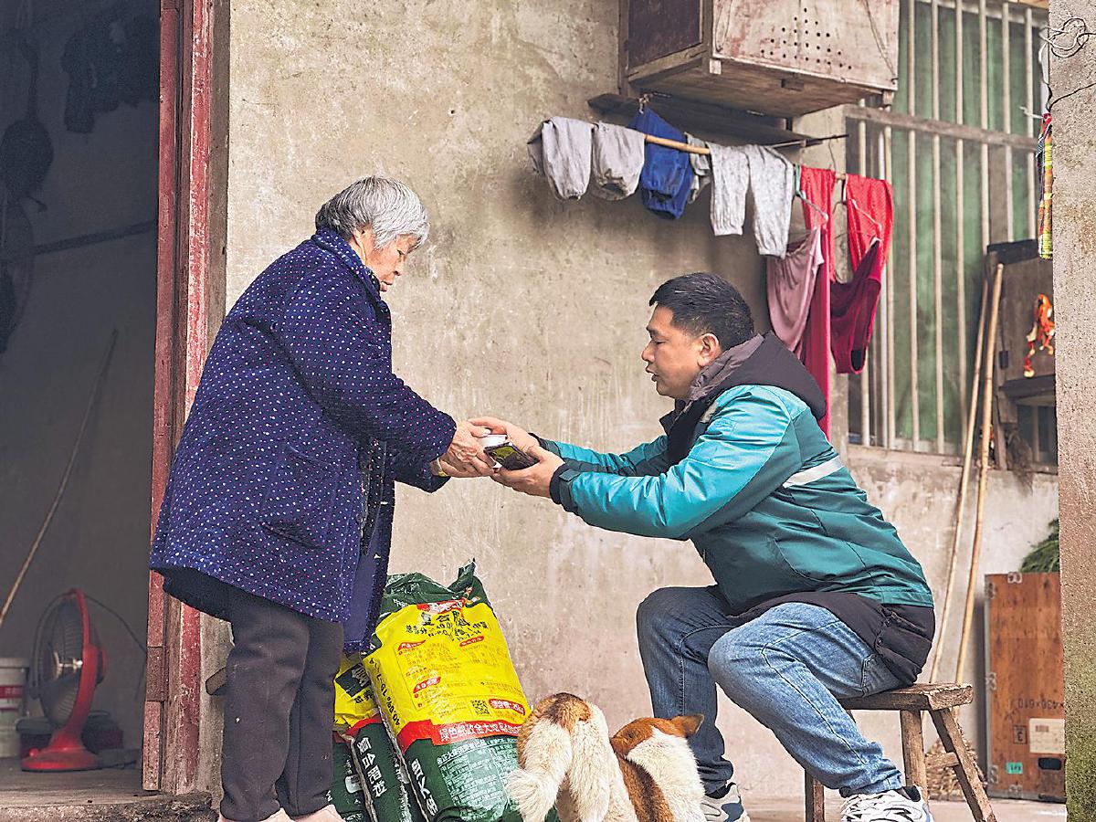 廣安市郵政分公司投遞員一大早將化肥送到農(nóng)戶家中,農(nóng)戶端出一杯水表示感謝。 □劉雙華 攝