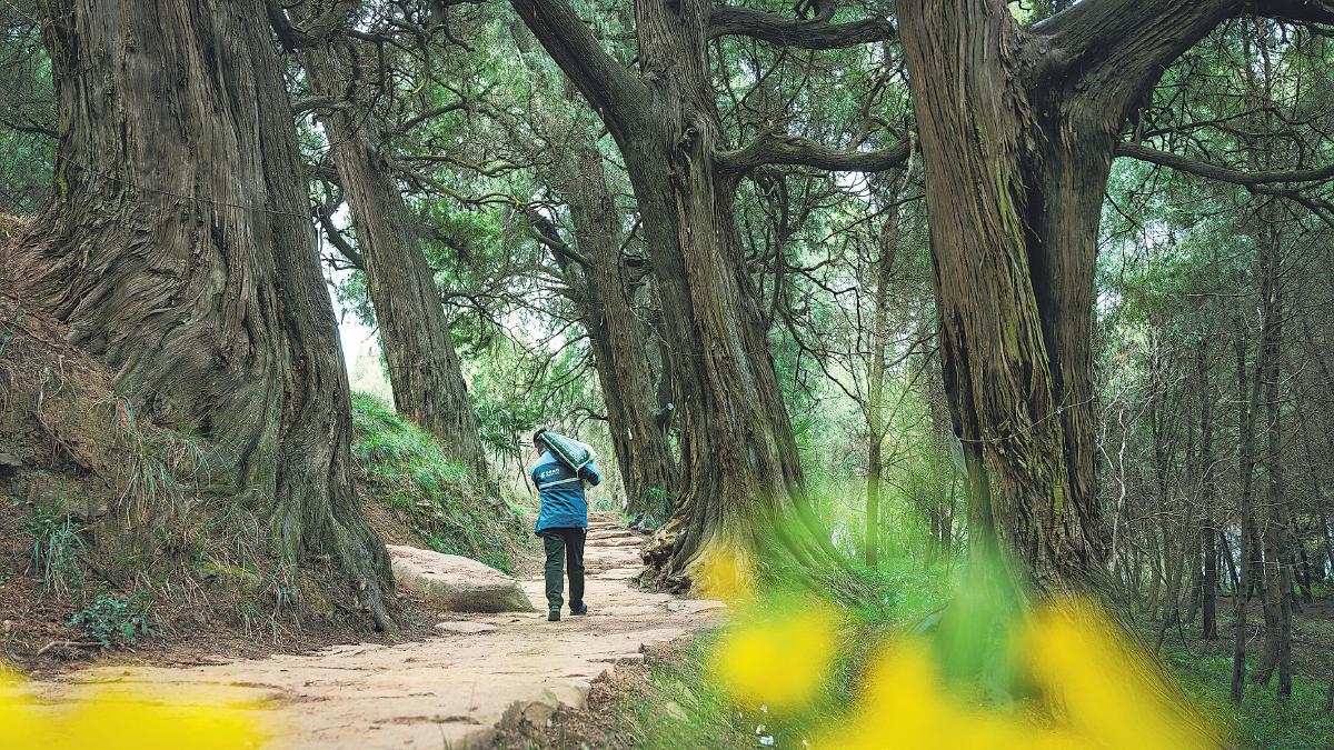 劍閣縣郵政分公司投遞員為龍?jiān)存?zhèn)的農(nóng)戶送肥料,途中經(jīng)過蜀道古柏群?!鯊埰健z