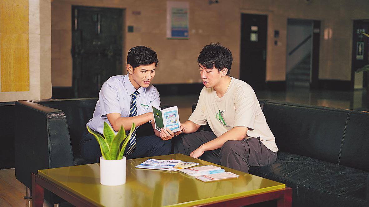 黃浦區(qū)支行營業(yè)部理財(cái)經(jīng)理為客戶介紹理財(cái)產(chǎn)品。