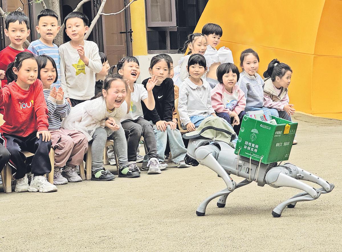 小朋友通過(guò)“小小郵遞員”“小小銀行家”等角色扮演,與機(jī)器狗互動(dòng),體驗(yàn)送報(bào)、送信、送快遞,學(xué)習(xí)認(rèn)識(shí)錢幣等知識(shí)?,F(xiàn)場(chǎng)還設(shè)立了集郵文創(chuàng)產(chǎn)品、幼兒畫報(bào)圖書展示區(qū),吸引了眾多師生前來(lái)打卡。圖為“郵小驛”機(jī)器狗一出場(chǎng)就獲得小朋友喝彩。